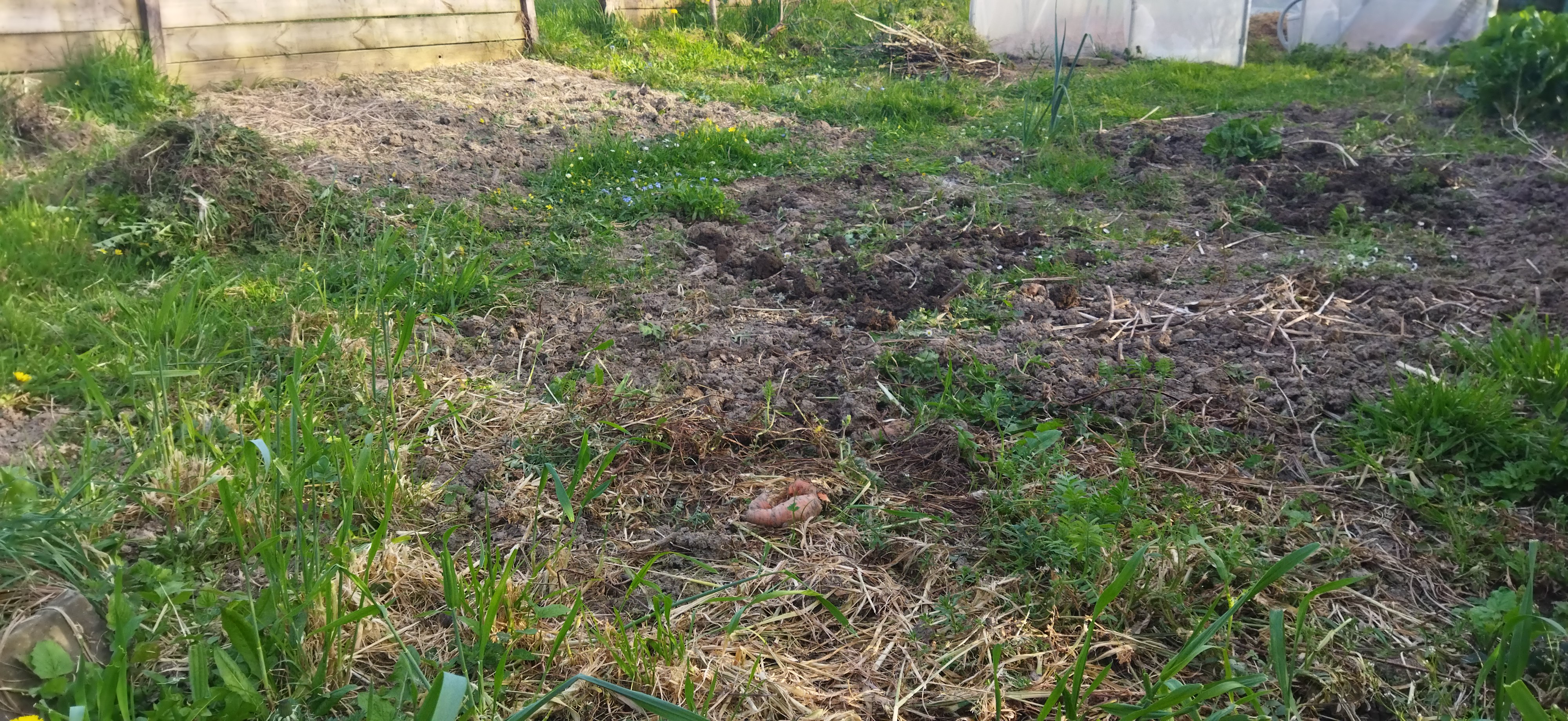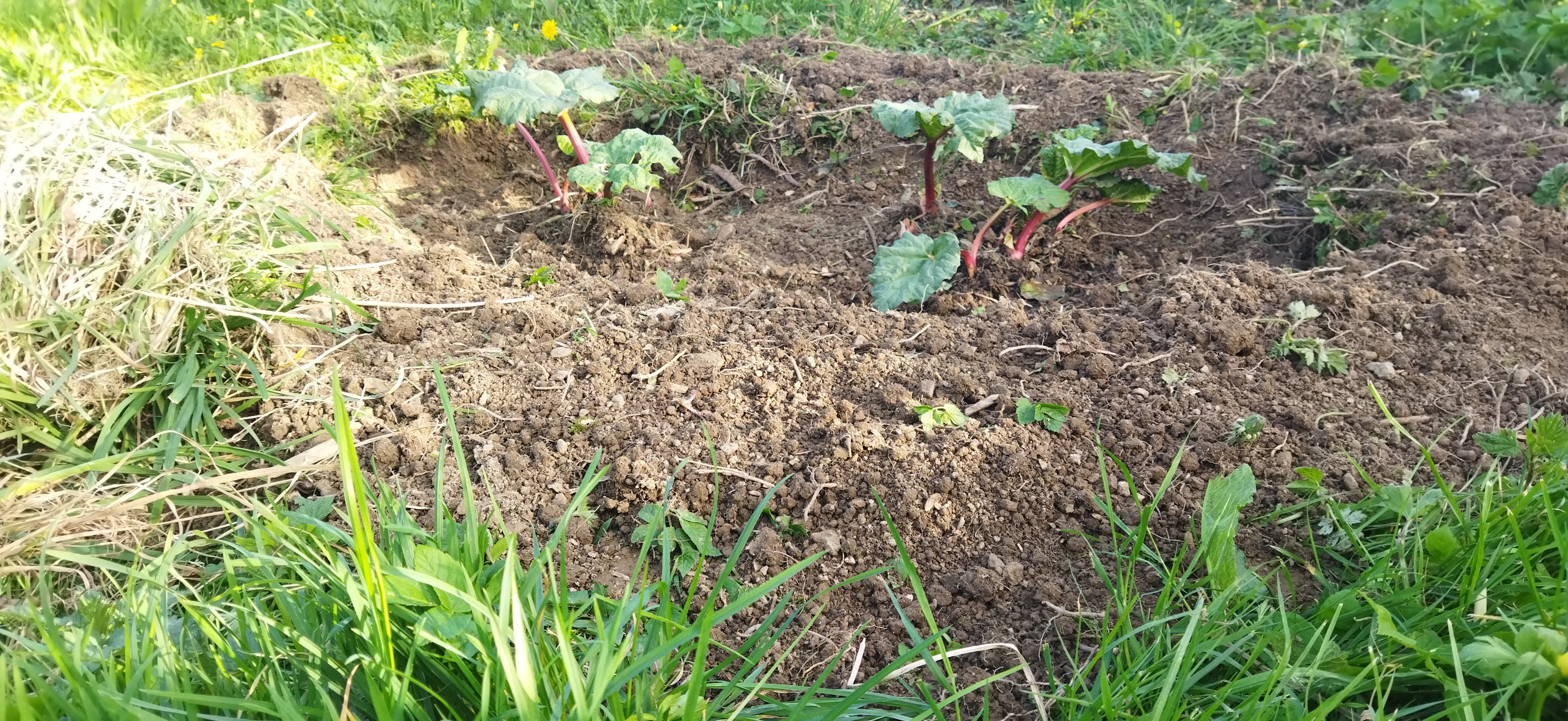 - Les pissenlits, les boutons d’or et les rumex (également connus sous le terme de « doches »…) sont à retirer en priorité. A retirer du potager uniquement, cela s’entend; ailleurs ils ne dérangent personne! Ensuite, selon le temps, l’humeur et l’envie, les plus petites adventices; celles-ci seront identifiées comme moins envahissantes et moins teigneuses que les premières, leur tour pourra attendre! Evidemment, les premières pousses de pissenlits pourront servir en salade. Après cette heure de travail, la parcelle de plantation prendra forme.