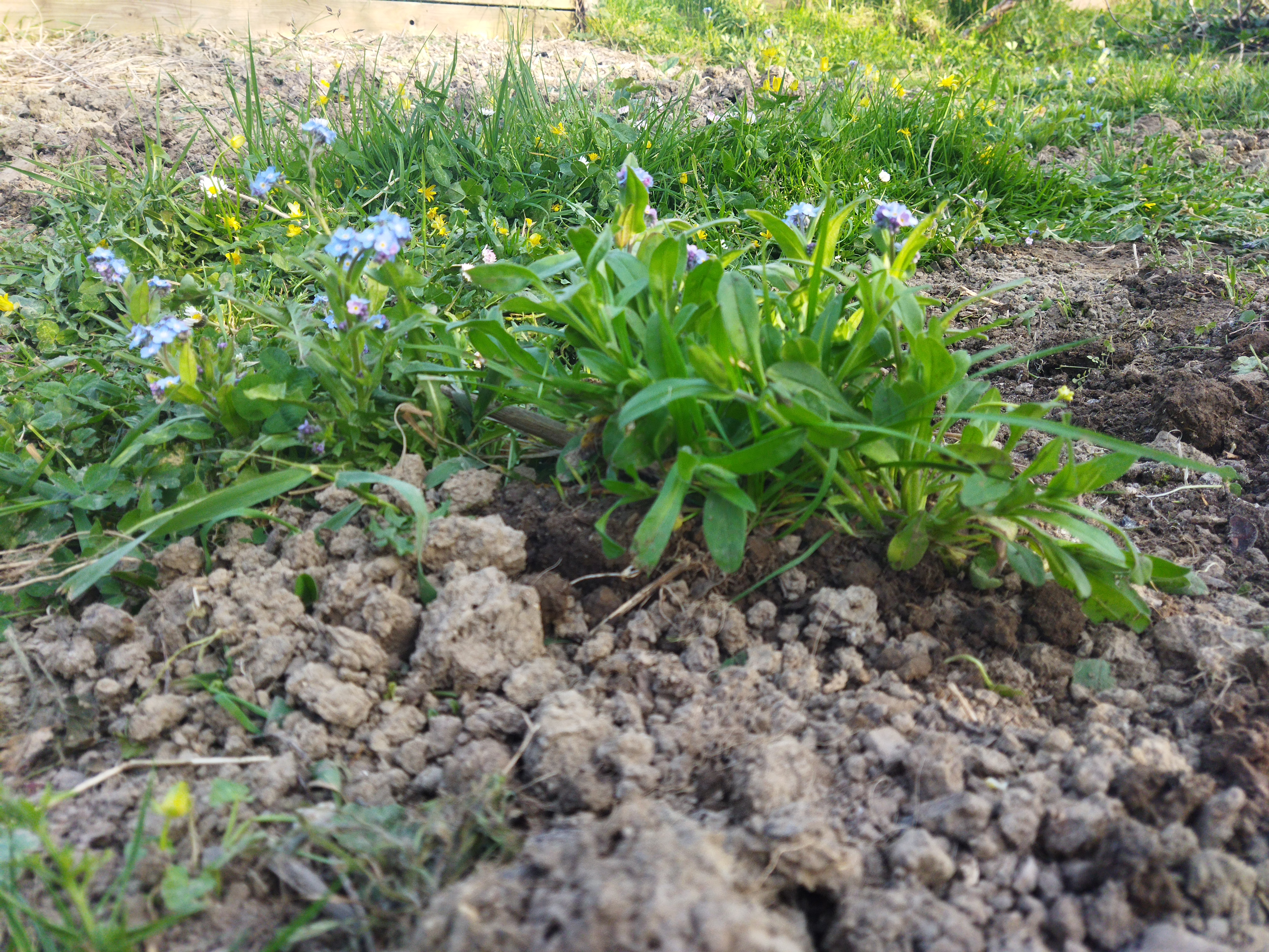Avant de terminer, le cas particulier des myosotis. C’est envahissant mais joli. Que faire? Pourquoi pas les regrouper? Un coup de pelle d’un côté et le trou sera comblé par le coup de pelle qui servira à les replanter…cqfd!